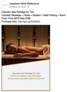 Social media has really opened an entire new world of business opportunities and allow you to promote yourself to your customers (and their friends) directly in real time. By offering a promotion or discount to your followers, at times that are quiet, or promote special interest occasions this will give people an incentive to purchase from you, while providing you with a channel to directly communicate your business benefits, promotions and news. Win-win! You can then pay to promote the offer to reach a wider circle of potential customers and patrons.”